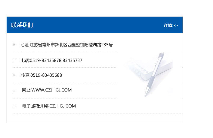 地址:常州市新北區友邦商務大廈1幢16、17層  電話:0519-85101652  傳真:0519-85112595  郵編:213022  網址:www_cz-jiayue_cn.tzdongxu.com  郵箱:xiajifengaa@163.com
